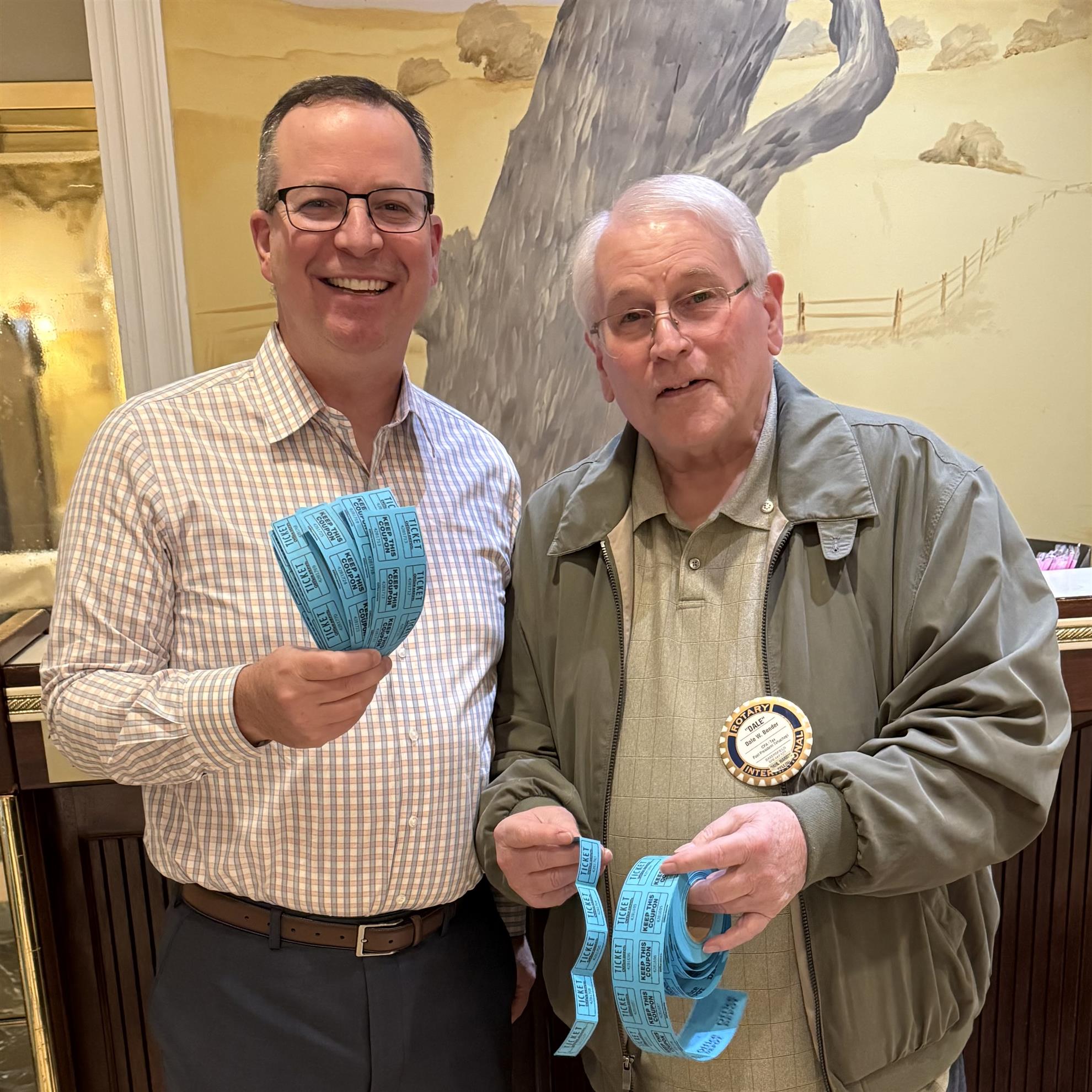 GREETERS, JEFF BELL and DALE BENDER, greeted the masses with smiles and 50/50 Opportunity Drawing tickets in hand — proving once again that Rotary hospitality comes with a shot at easy money.